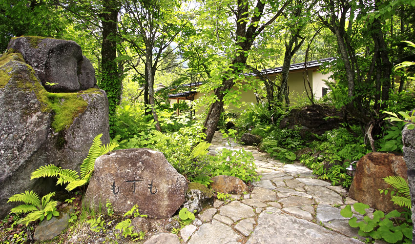 川のせせらぎ 木立のしらべ 季節を表す木々の色 移り変わる自然美に心あらわれ ゆるりと時が流れていく 『もずも』とは 乗鞍より流れる毛受母川に由来し その昔 神々が出雲へ往還の際 旅の疲れを癒した清流と伝えられている そこに『贅』はなく ただひたすらに自然との調和を目指す やわらかな樹木のささやきに包まれ 心ほどけるひとときを