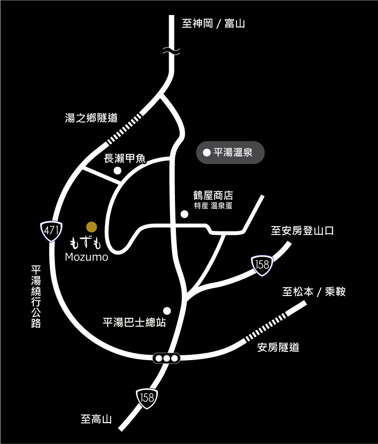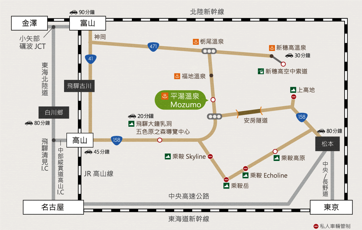 ◇北陸道金澤東I.C-小矢部礪波JCT(岐阜方向)-東海北陸道-飛驒清見I.C-中部縱貫道高山I.C-(R158)-平湯溫泉(從高山I.C下,繼續行駛大約50分鐘)